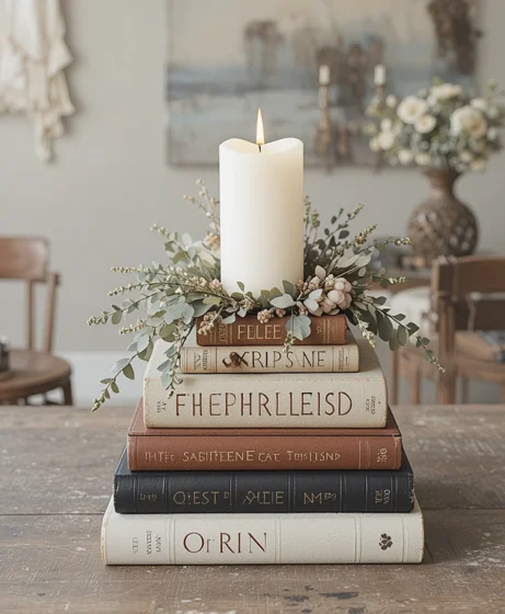 Stack three or four vintage books and place pillar candles on top. The layered height creates dimension while the candlelight adds warmth. This book table centerpiece works beautifully for fall gatherings or cozy living rooms.