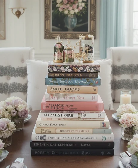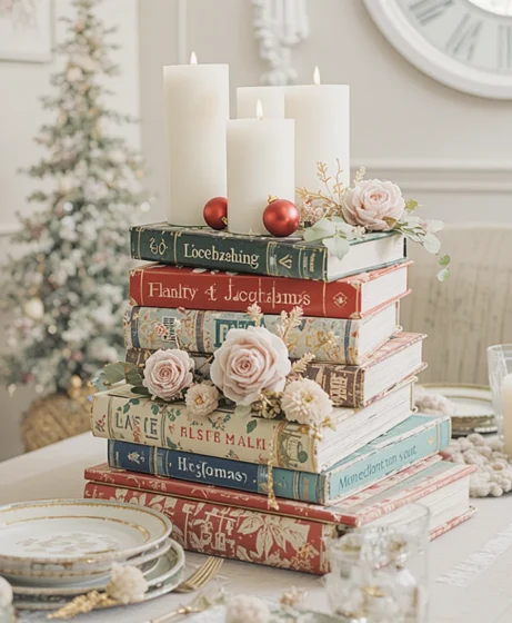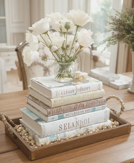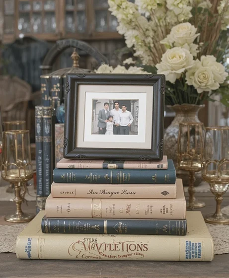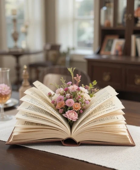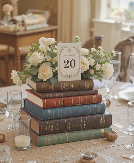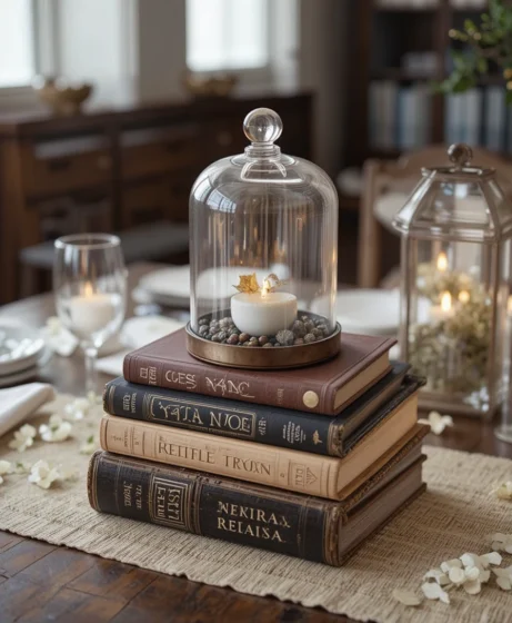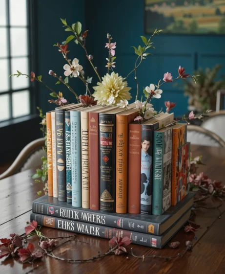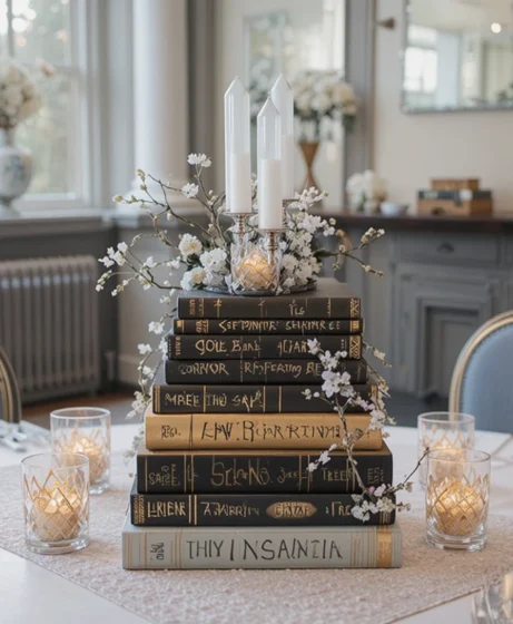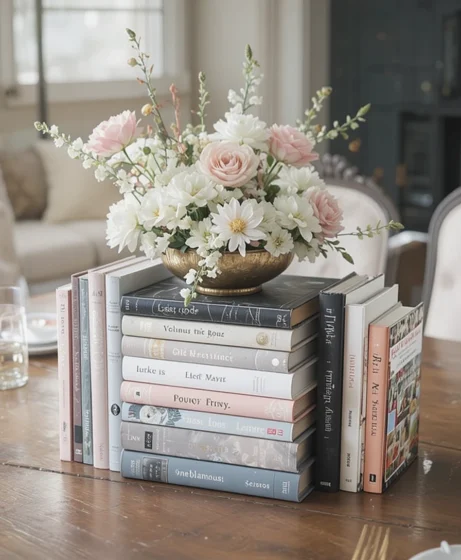 Match book covers with seasonal décor colors. For example, warm tones in autumn or soft pastels in spring. This rotating book centerpiece décor keeps your table fresh year-round.