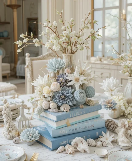 Use blue and white books paired with seashells or coral accents. This creates a light, beach-inspired centerpiece. It’s ideal for summer décor.