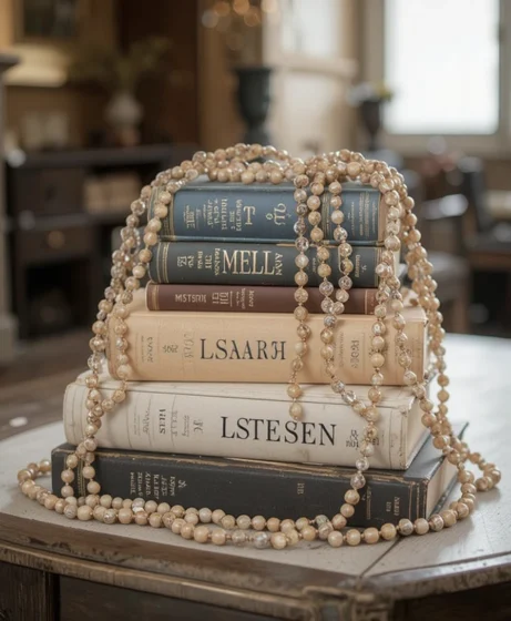 Add wooden or glass beads draped across stacked books. The texture enhances visual interest. This layered look feels curated and intentional.