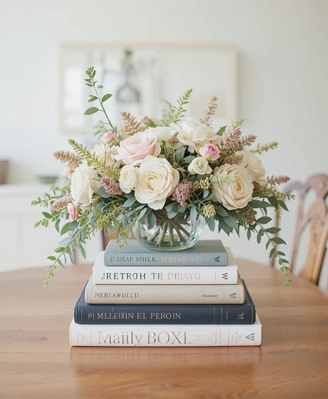 Use hardcover books as a base for a fresh flower arrangement. The books lift the flowers, giving them prominence. This combination of literature and blooms creates a romantic and balanced centerpiece.