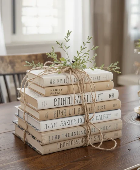 Wrap neutral-toned books with twine or jute string. Add a small greenery sprig for a farmhouse-inspired look. This rustic book centerpiece idea is simple yet charming.