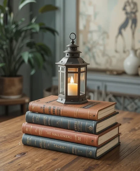 Pair an old antique book with a small lantern. The vintage feel creates a cozy and nostalgic mood. This design works beautifully for entry tables.