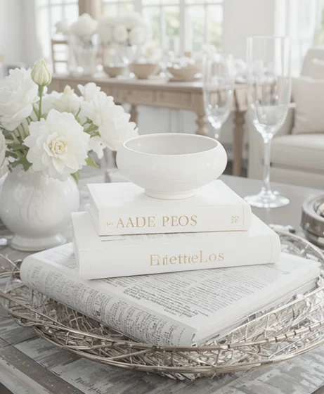 Use white or neutral book covers for a clean look. Stack them evenly and top with a simple ceramic object. This minimalist centerpiece fits modern homes.