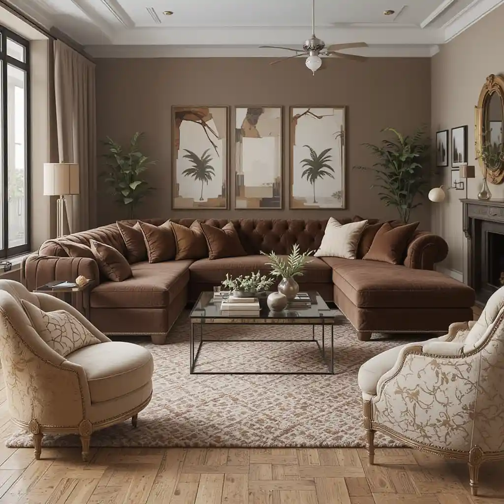 Choose a large sectional or tufted sofa in espresso or cocoa to serve as the centerpiece of the room. It’s cozy, practical, and visually grounding.