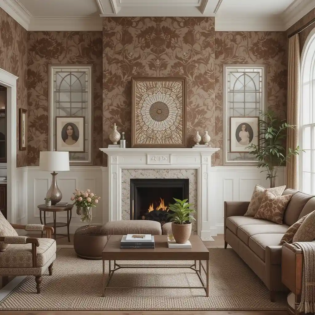 Use wallpaper with brown floral, geometric, or abstract patterns to add style and depth without overwhelming the entire space. Brown Living Room