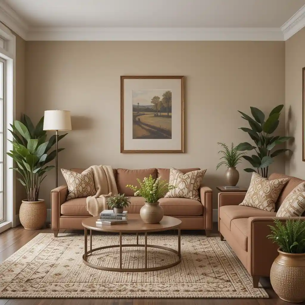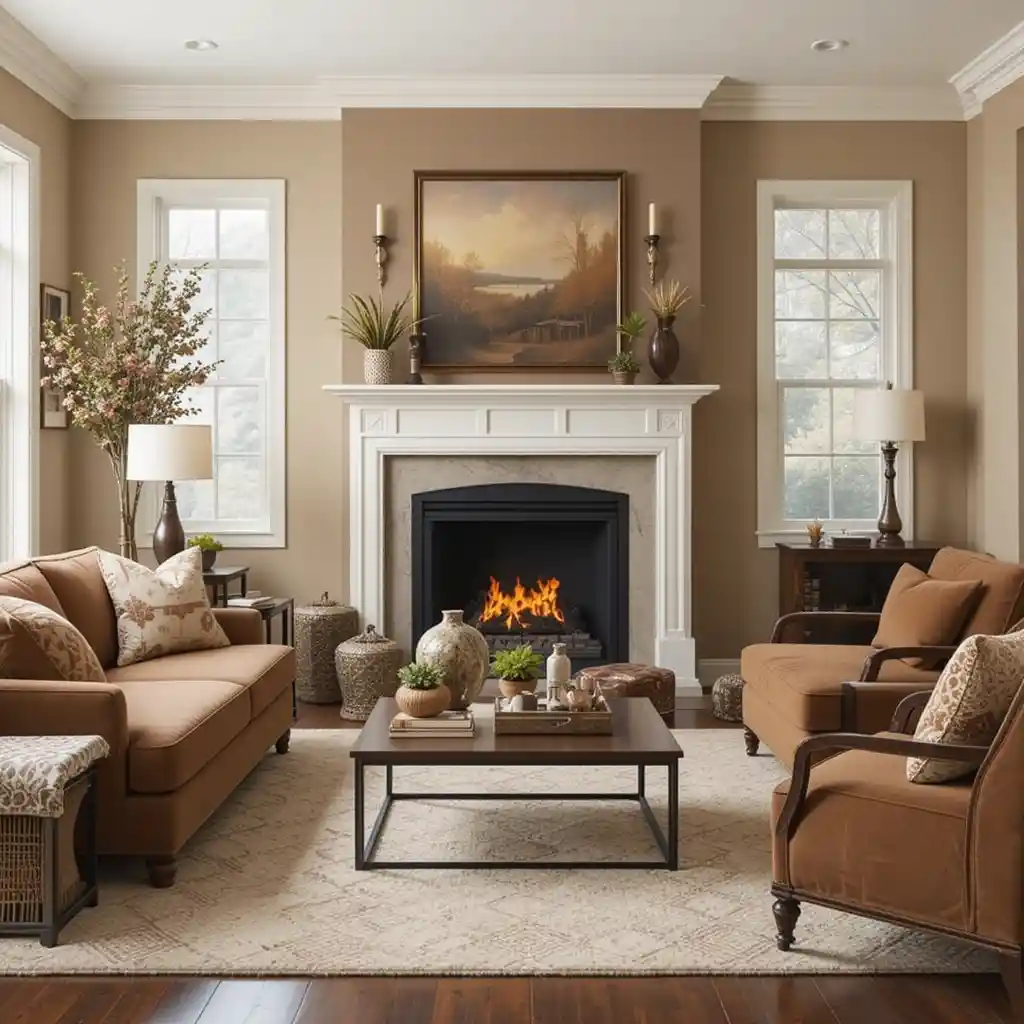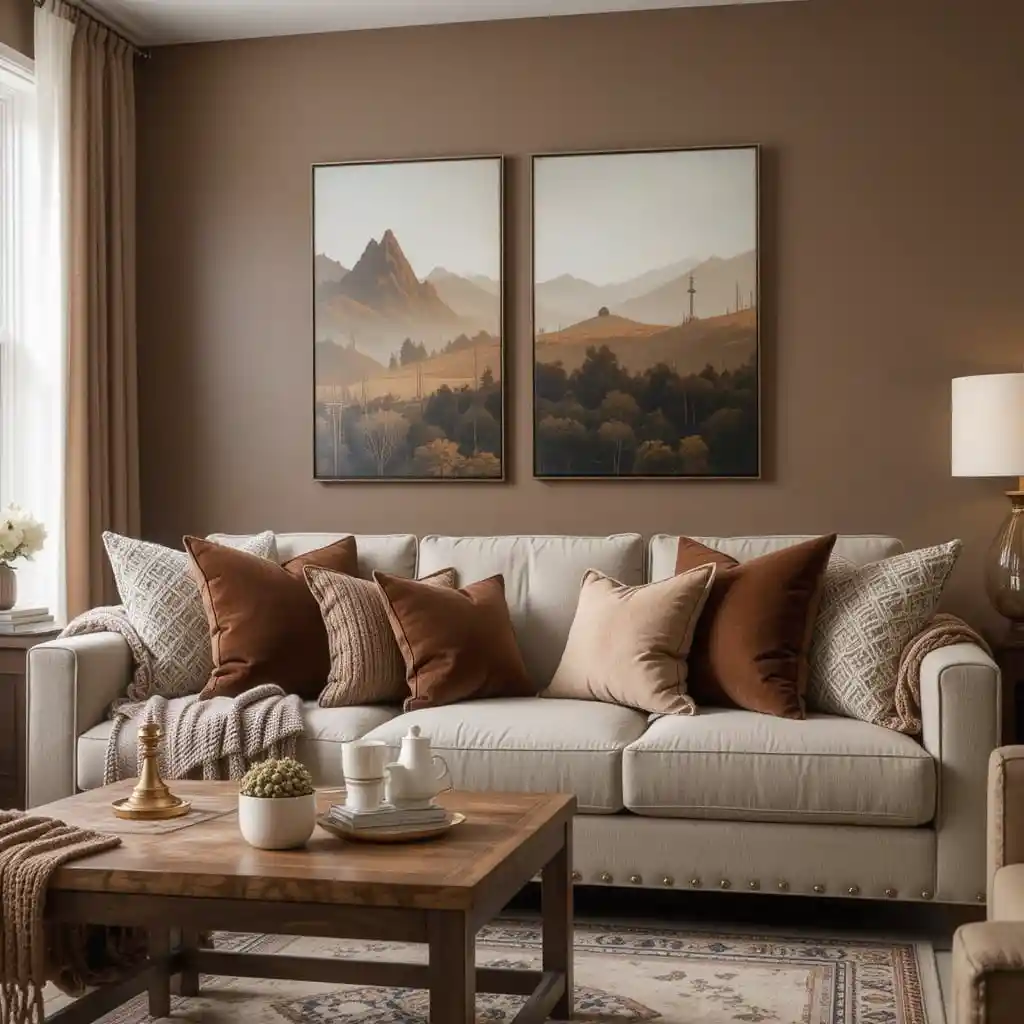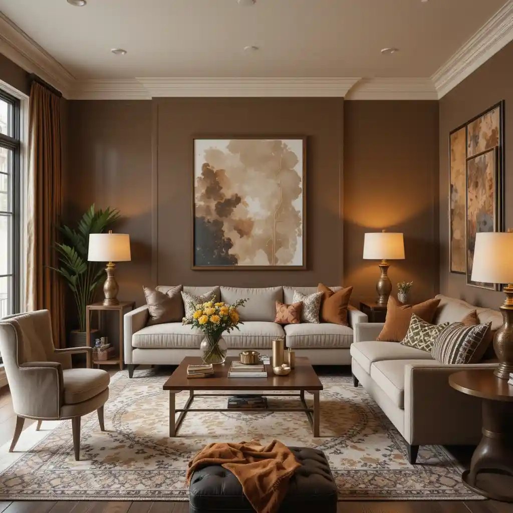 Soften the space by incorporating beige, cream, or taupe accents in throws, lampshades, or upholstery. This adds a light contrast and keeps the room from feeling too heavy. Brown Living Room