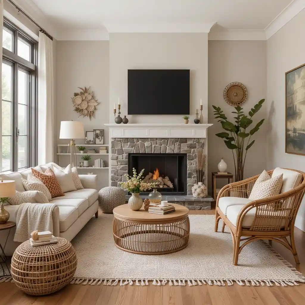 Brown rattan chairs or wicker baskets offer texture and style, especially for boho or coastal themes. These materials work well in neutral-toned rooms. Brown Living Room