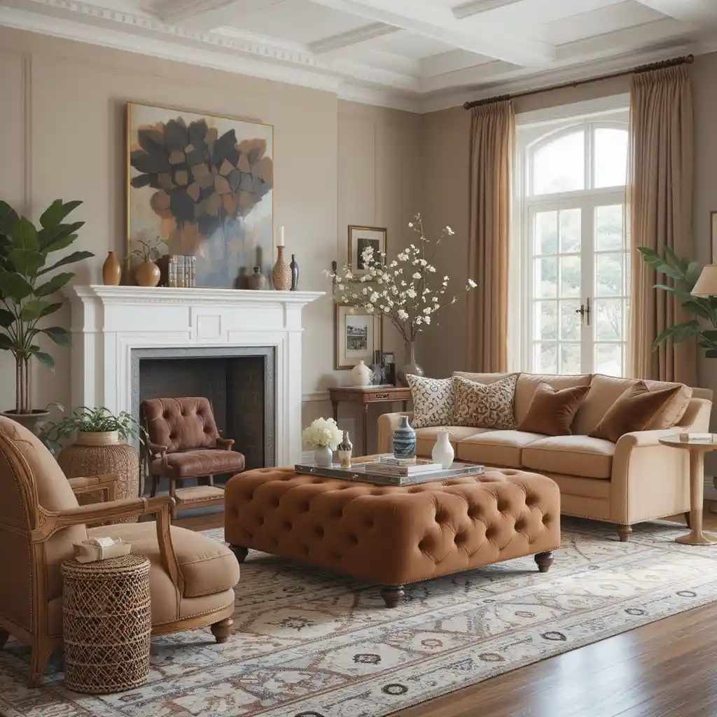 Swap out a traditional table for a brown tufted ottoman, which adds softness and extra seating or storage while blending into the color scheme.