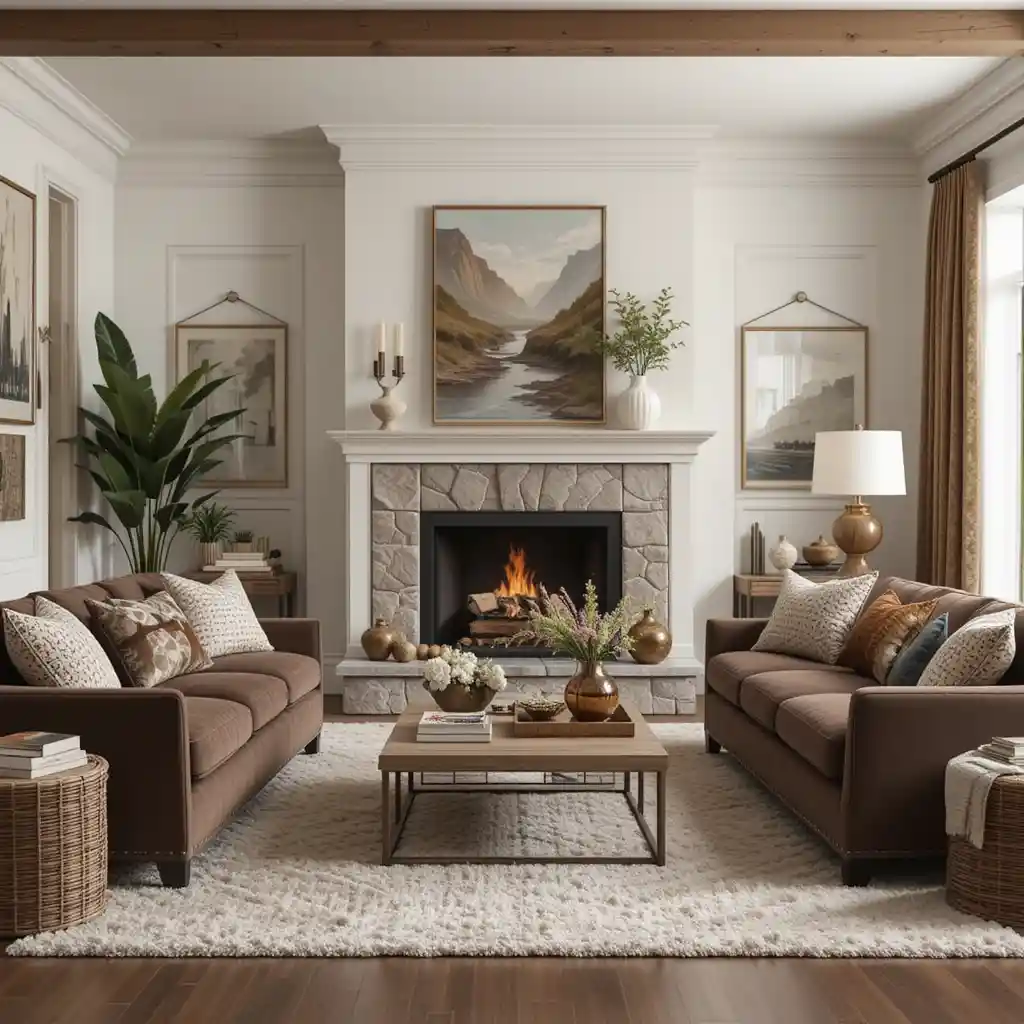 If you prefer a minimalist look, use brown in small accents like candle holders, trays, or pottery. Even these tiny details add warmth and cohesiveness. Brown Living Room