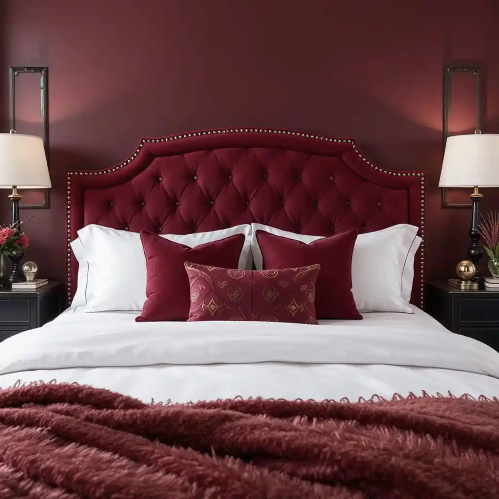 A velvet or tufted headboard in burgundy creates a luxurious and stylish centerpiece, perfect for glam or vintage-inspired bedrooms. Burgundy Bedroom Ideas