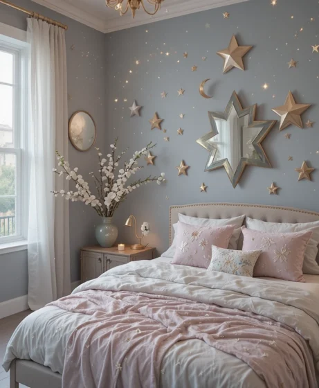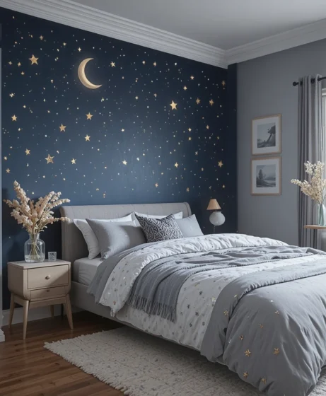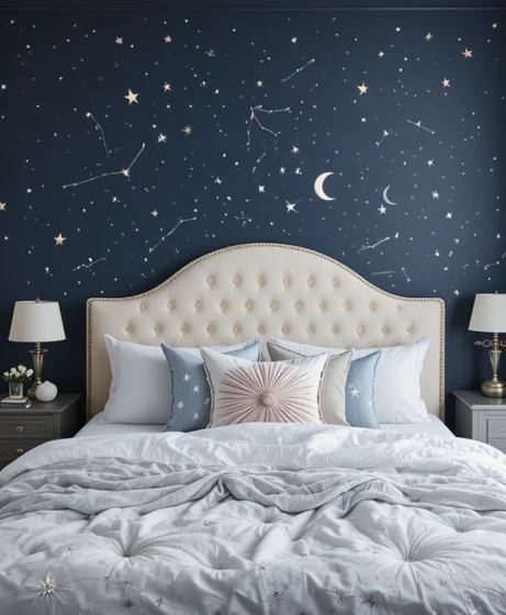 Create a dramatic focal point by painting one wall deep navy and adding gold or silver stars. This gives your room the feeling of sleeping under the night sky. Use peel-and-stick decals for a clean, easy application without damaging your walls Celestial Bedroom.