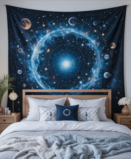 Hang bold moon-phase artwork above your bed to bring balance and harmony into the room. Choose metal, wood, or acrylic styles for a modern touch. This instantly anchors your bedroom with a mystical celestial theme Celestial Bedroom.