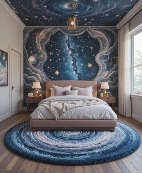 Add a swirl-patterned rug inspired by the Milky Way to anchor the room. It adds warmth and visual flow to your bedroom. Choose plush textures for extra comfort underfoot Celestial Bedroom.