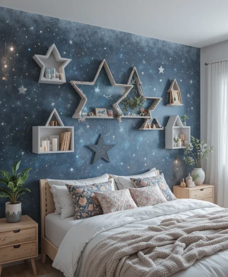 Install floating shelves shaped like stars or decorated with star motifs. These offer storage while blending perfectly into the celestial theme. Decorate them with crystals, candles, or small plants for a personalized touch.