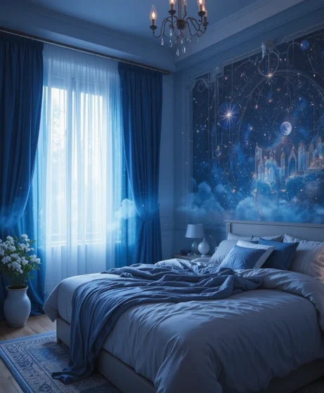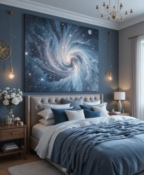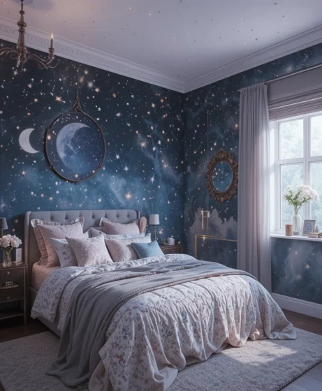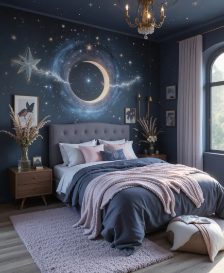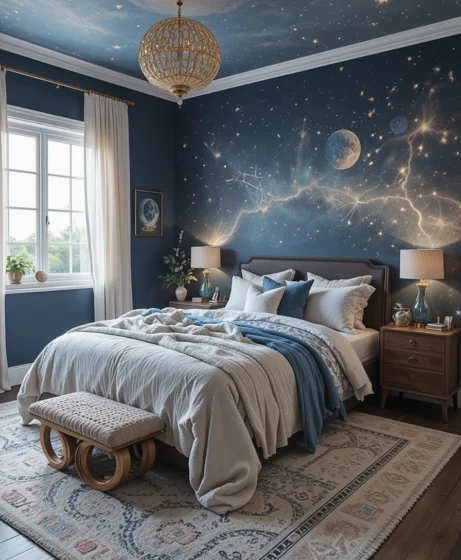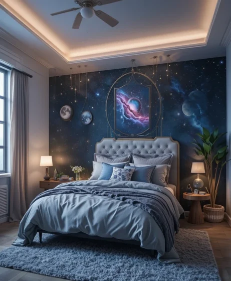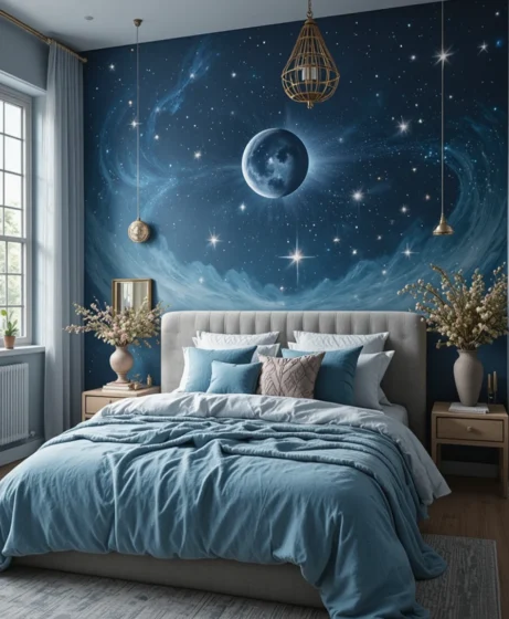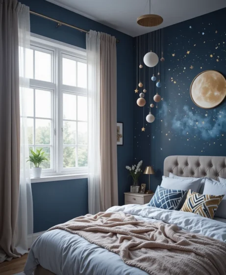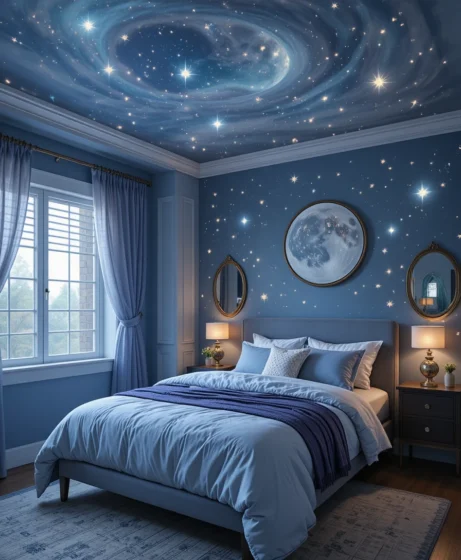 Painting your bedroom in midnight blue gives it a cool, peaceful look. This deep shade pairs beautifully with gold décor and moon-inspired pieces. It’s calming, stylish, and sets the perfect cosmic mood.