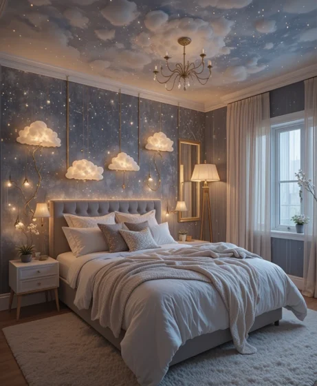 Soft cloud-shaped lights add a dreamy floating effect. They bring a soft glow perfect for relaxing nights. This décor adds a whimsical balance to the starry theme.