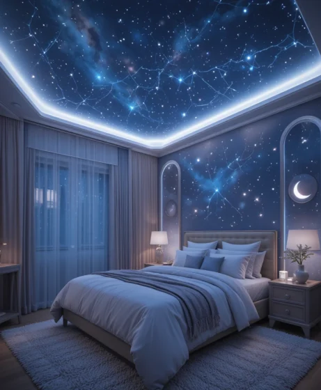 Line your ceiling edges with soft LED strips that resemble a glowing star path. This adds atmosphere and highlights your room’s shape beautifully Celestial Bedroom.