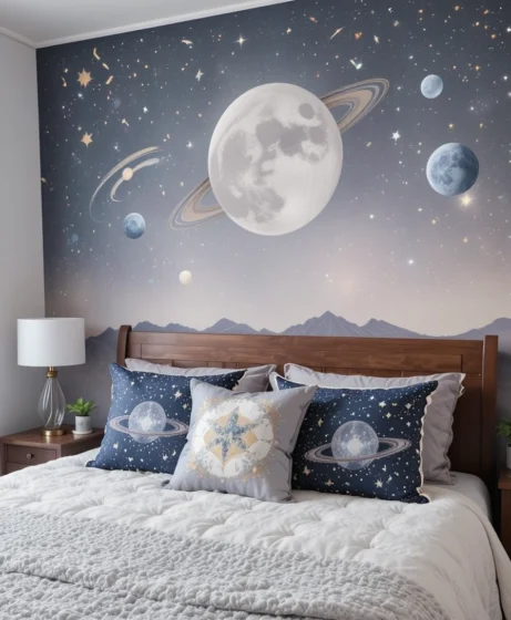 Use decorative pillows featuring planets, comets, or rings to enhance your bed décor. They add color, fun, and personality instantly.