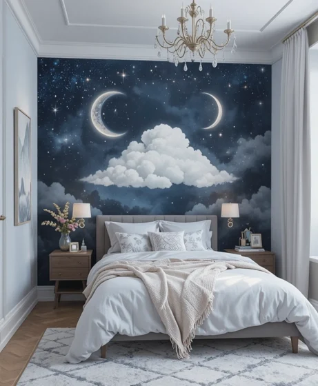 Constellation wallpaper instantly gives your bedroom a luxurious and celestial feel. Choose a subtle pattern for a minimalist look or a bold one for dramatic style. It brings depth and visual interest to the walls Celestial Bedroom.