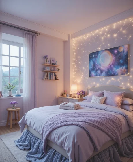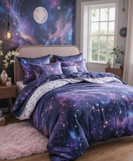 Choose soft microfiber or cotton bedding with galaxy prints in purples, navy, and soft pinks. It adds a playful yet relaxing vibe. Pair it with bold throw pillows to make the whole bed feel dreamy and star-filled.