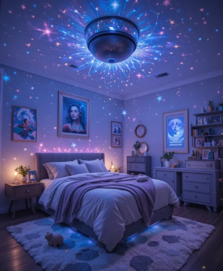 A star projector can transform your room instantly with shimmering lights across the ceiling. It creates a spa-like sense of calm at night. Pick one with adjustable colors so you can match the mood you want.