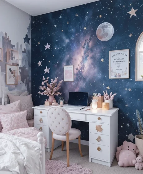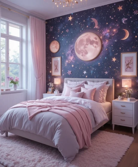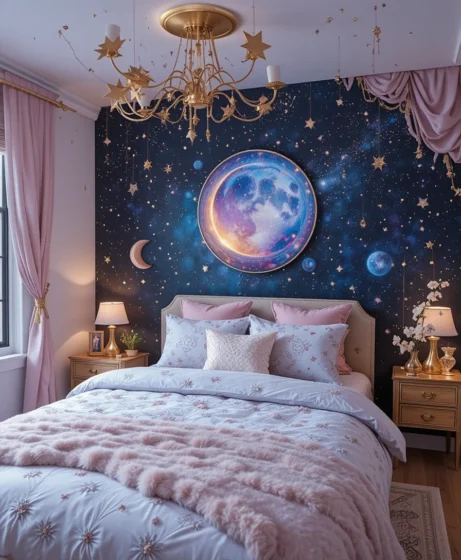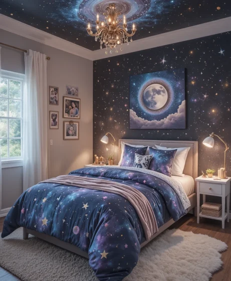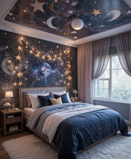 Whether you choose starry wallpaper, moon accents, or galaxy-inspired lighting, each idea transforms the room into a peaceful cosmic retreat.