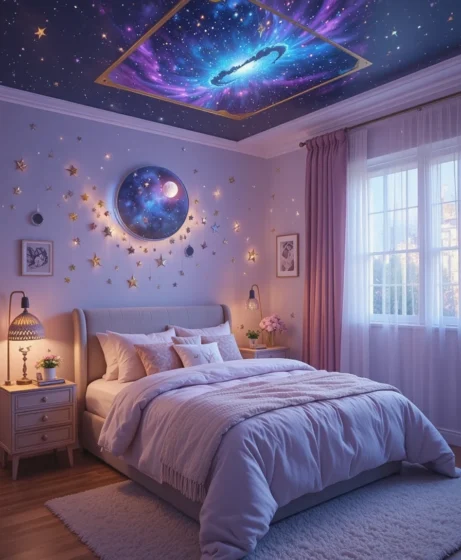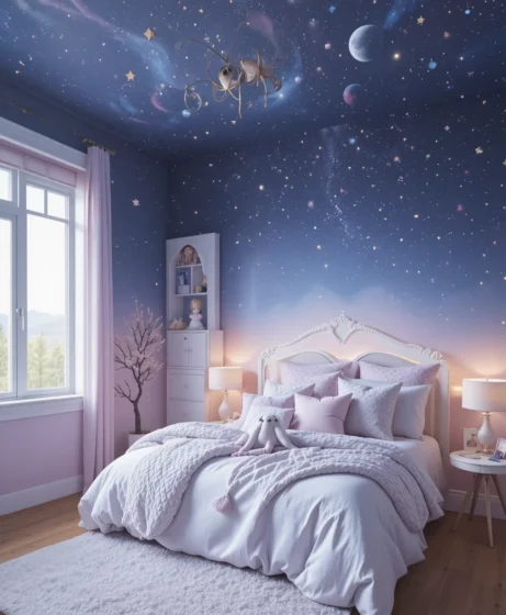 Design a cozy corner with floor cushions, string lights, and a galaxy blanket. This creates a peaceful space for reading or relaxing. Soft lighting adds to the dreamy cosmic feel Celestial Girls Bedroom .