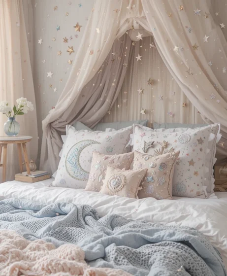 Decorative pillows with embroidered moons, suns, or stars add comfort and personality. They make the bed feel inviting and layered. Mix shapes and textures to enhance the celestial theme.