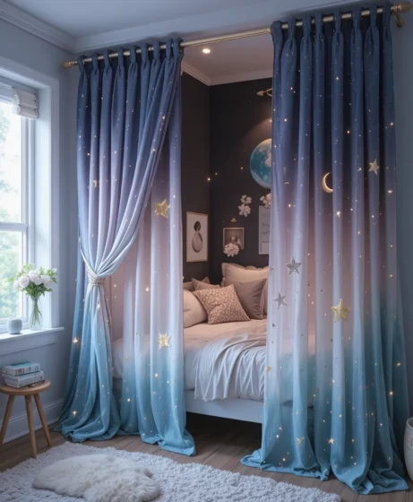 Choose curtains with stars, moons, or constellation prints to frame the windows beautifully. They add dimension and softness while enhancing the overall theme. Blackout versions also help improve sleep by blocking excess light.