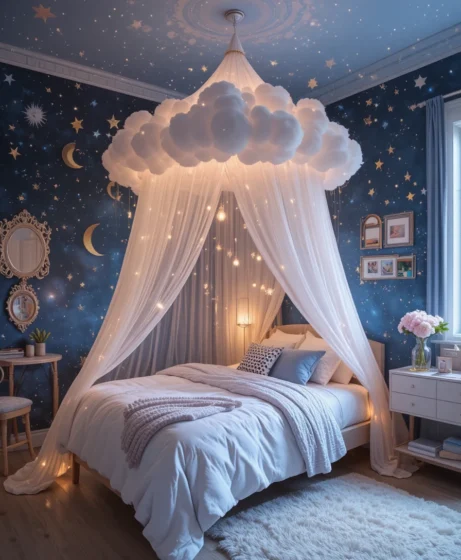 A soft, airy canopy that looks like floating clouds adds an enchanting touch. It makes the bed feel like a cozy sky nest. Opt for sheer white or pastel fabrics to keep the look light and Celestial Girls Bedroom.