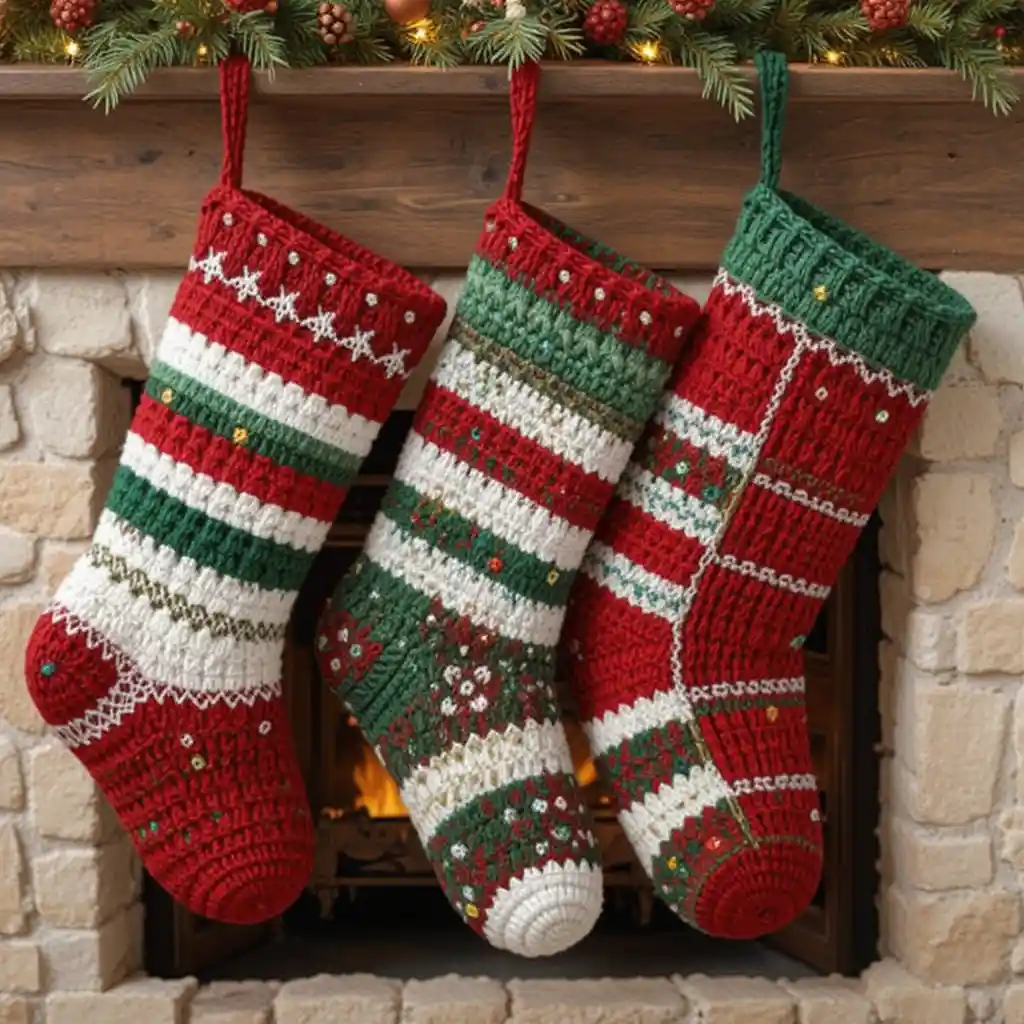 Handmade crochet stockings bring a personal touch to the fireplace. Use red, green, or white yarn to match the holiday theme and create designs with stripes or snowflakes. They make perfect family keepsakes that can be reused every year. Christmas Crochet Patterns