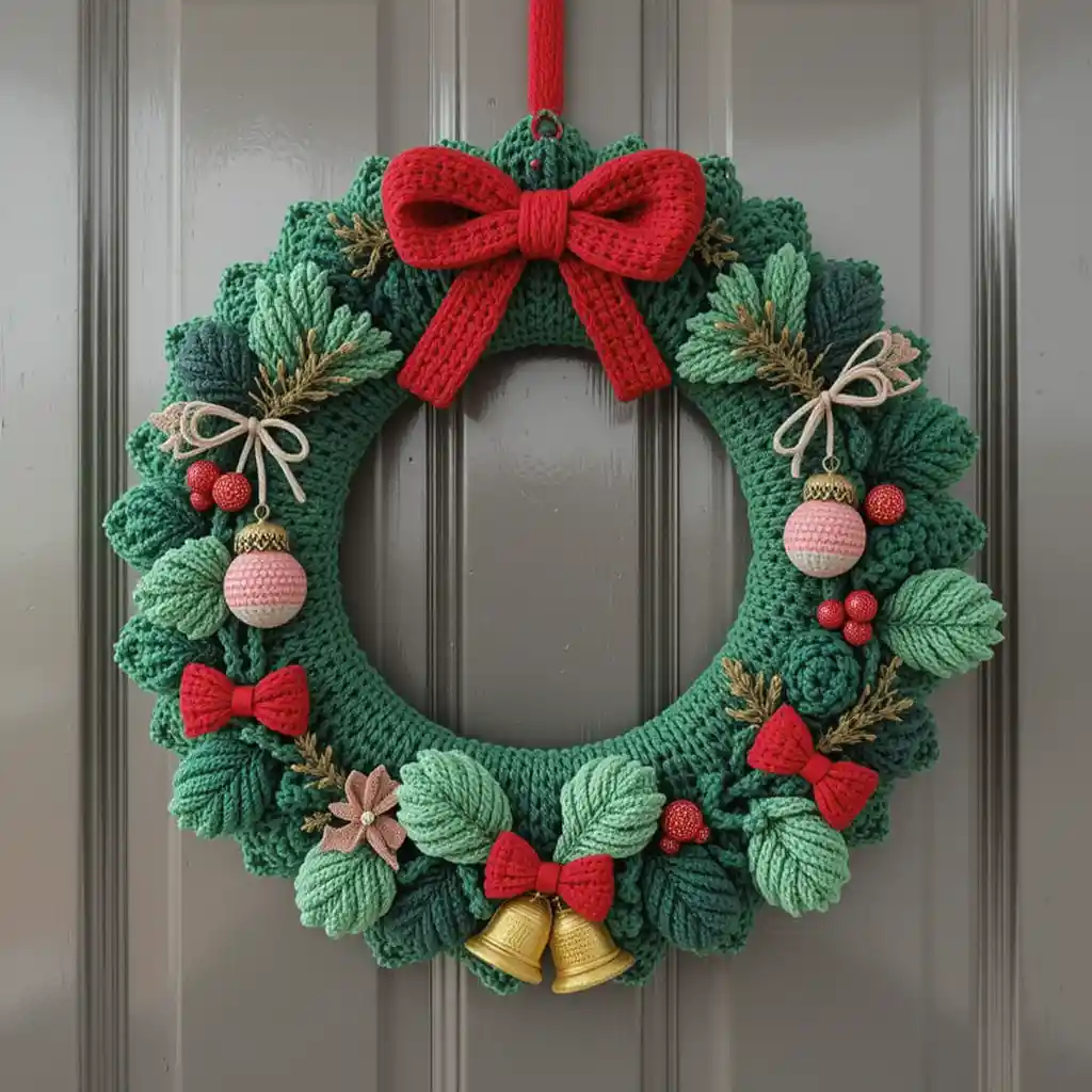 A crochet wreath wrapped with green yarn and decorated with bows, bells, or berries creates a welcoming holiday entryway. This handmade piece lasts for years and adds charm to the front door.Christmas Crochet Patterns