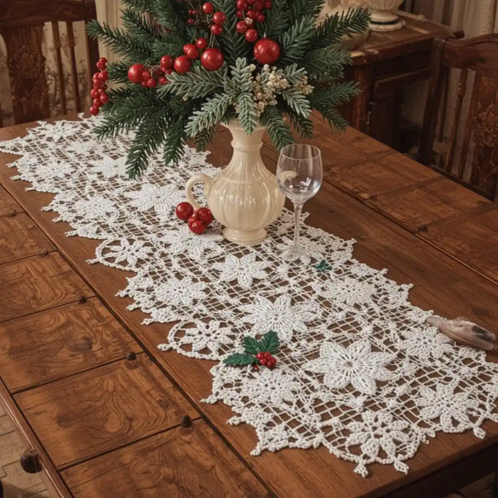 A crochet table runner featuring stars, holly leaves, or snowflakes elevates your dining experience. It’s an elegant way to highlight your holiday centerpiece and impress guests.