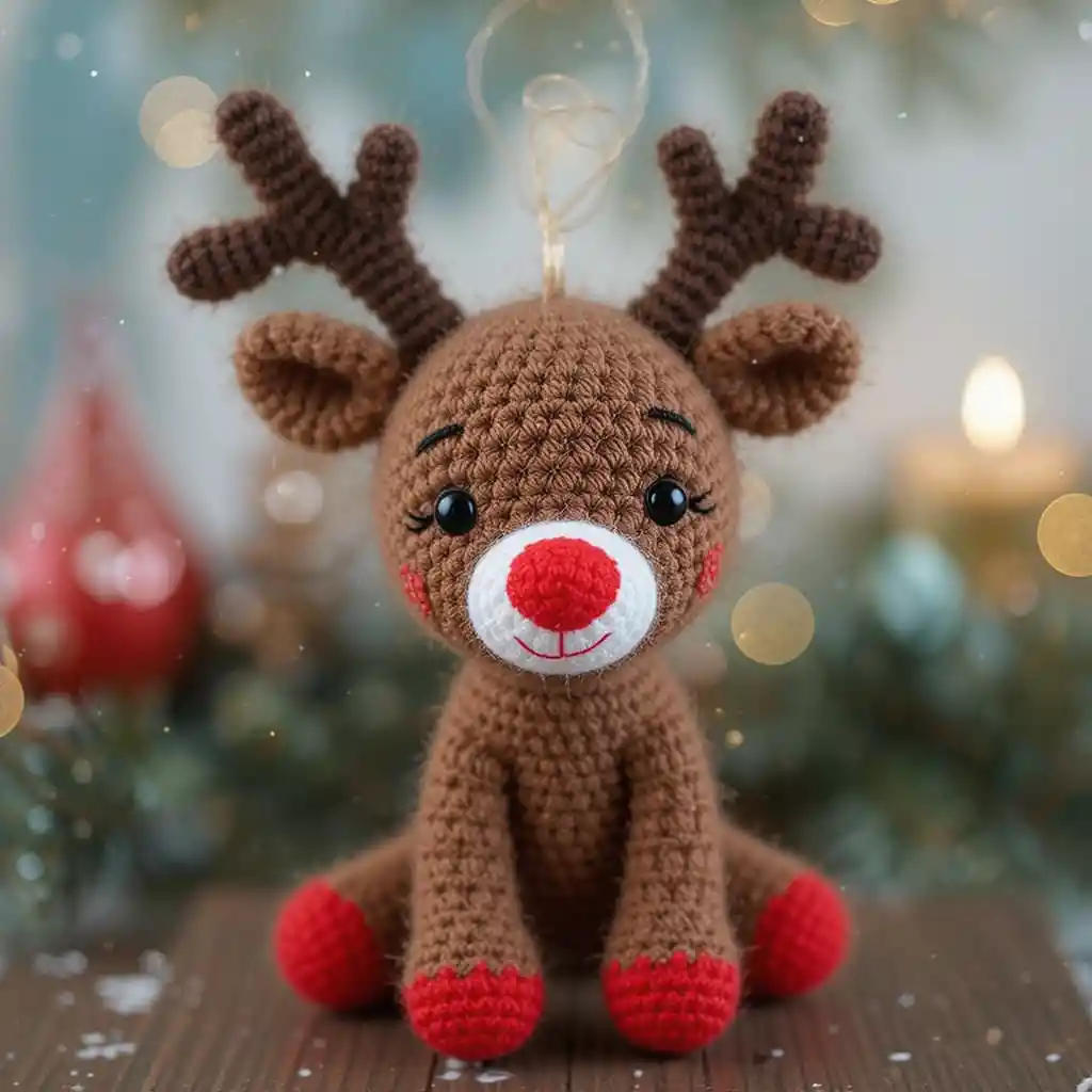 Amigurumi reindeer make adorable holiday decorations. With brown yarn, red noses, and antlers, these little creatures can be displayed on shelves or gifted to children as cute Christmas toys.