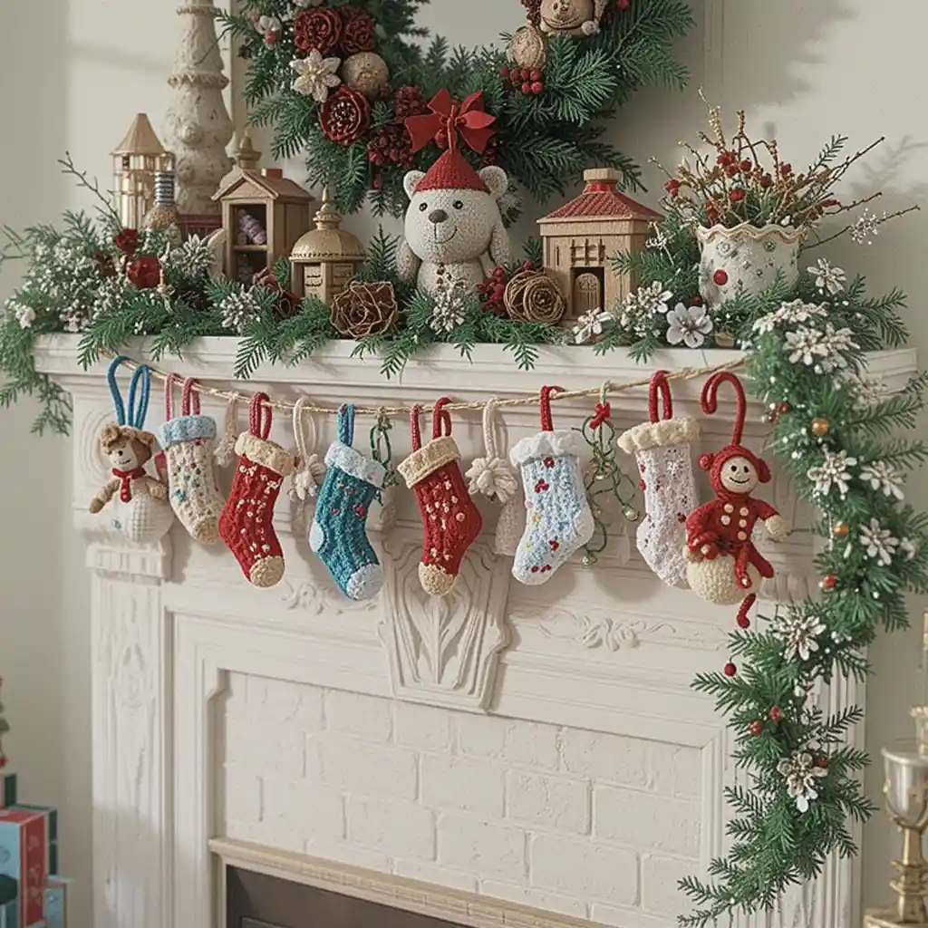 A crochet garland made of stars, stockings, or bells creates a magical vibe when draped across the mantle or staircase. It’s reusable and can be customized in different festive colors.
