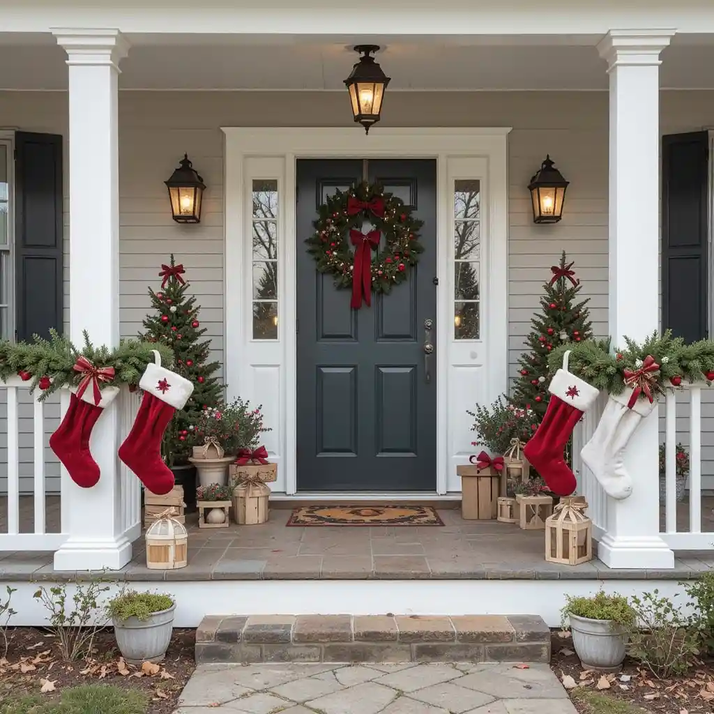 Hang oversized outdoor stockings from porch railings for a whimsical and festive display.