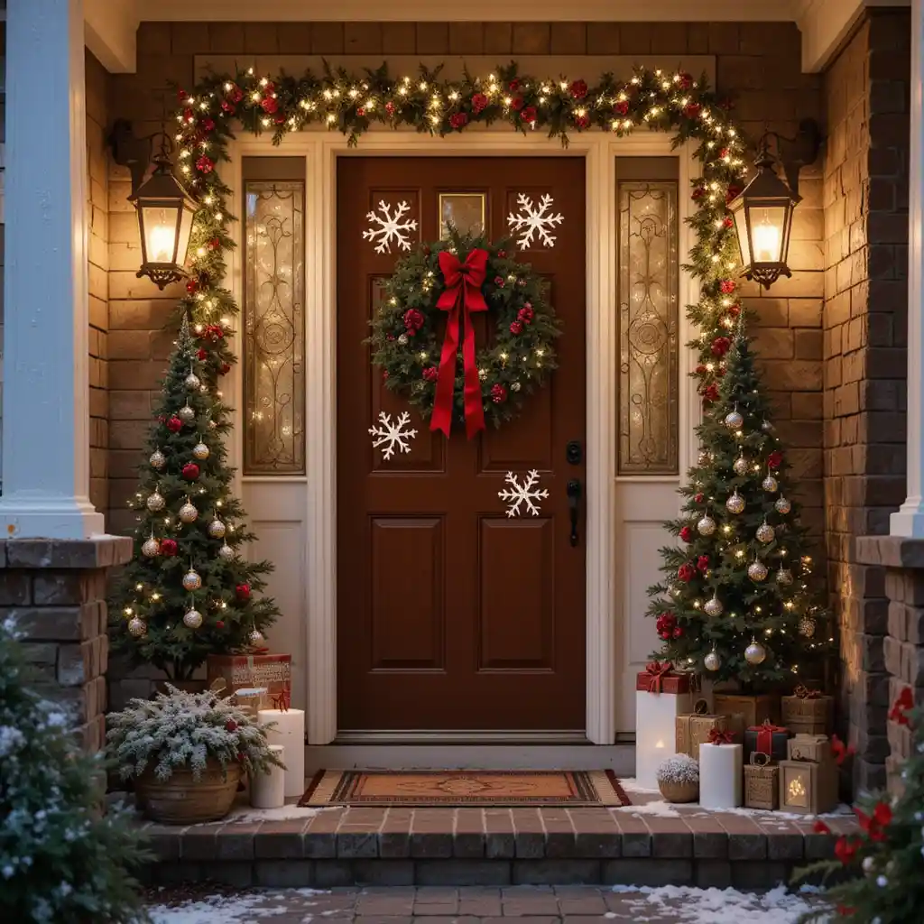 Attach snowflake cutouts or decals to your front door for a crisp, wintry touch that feels magical.