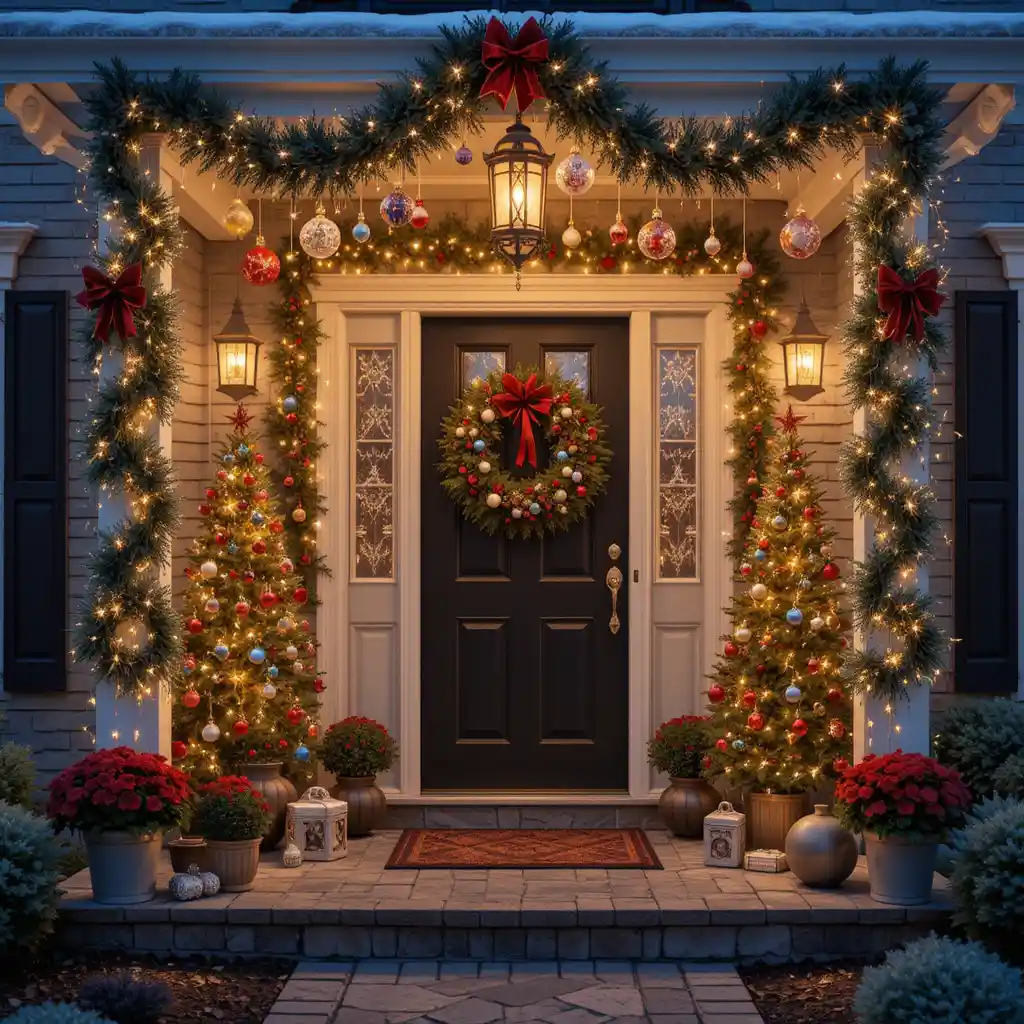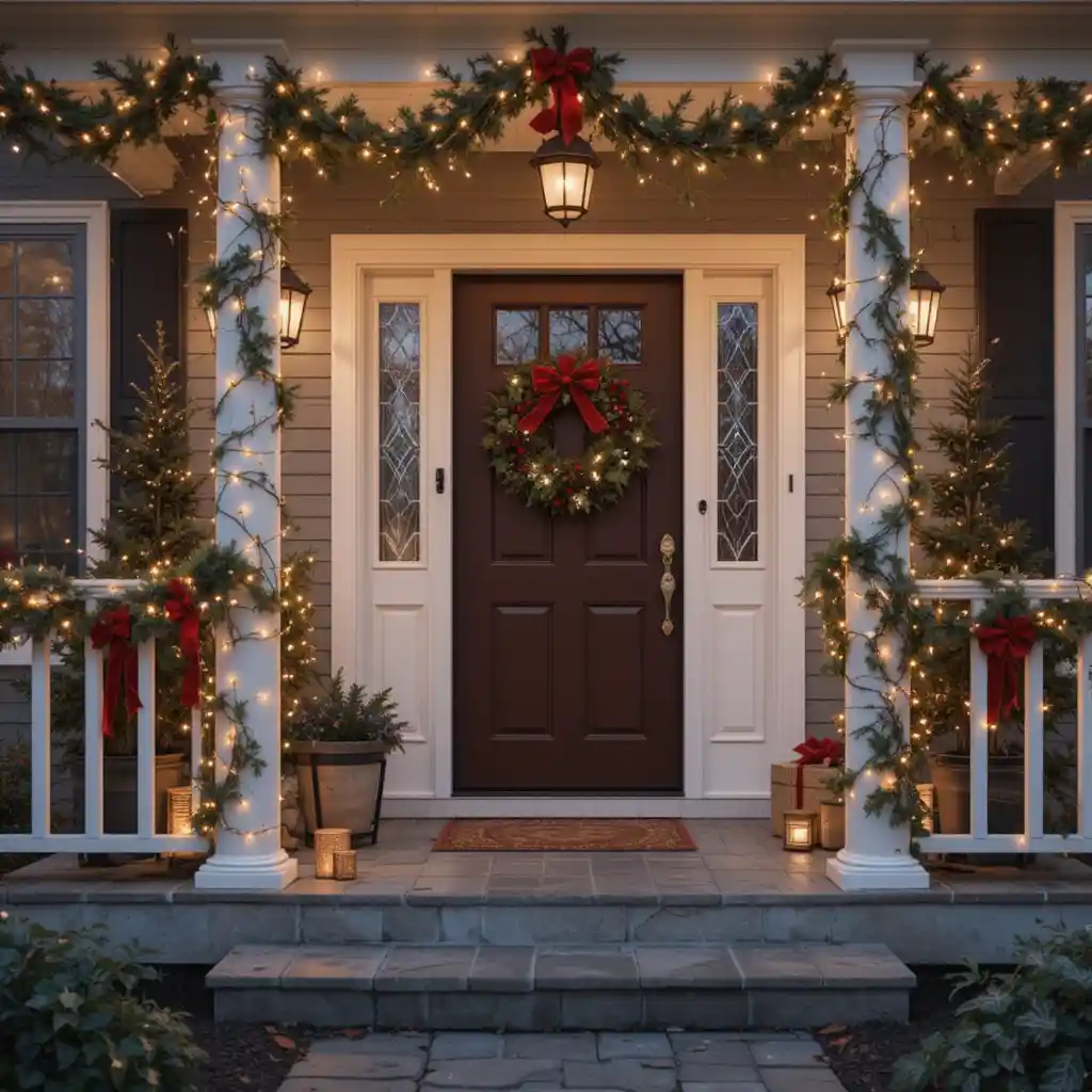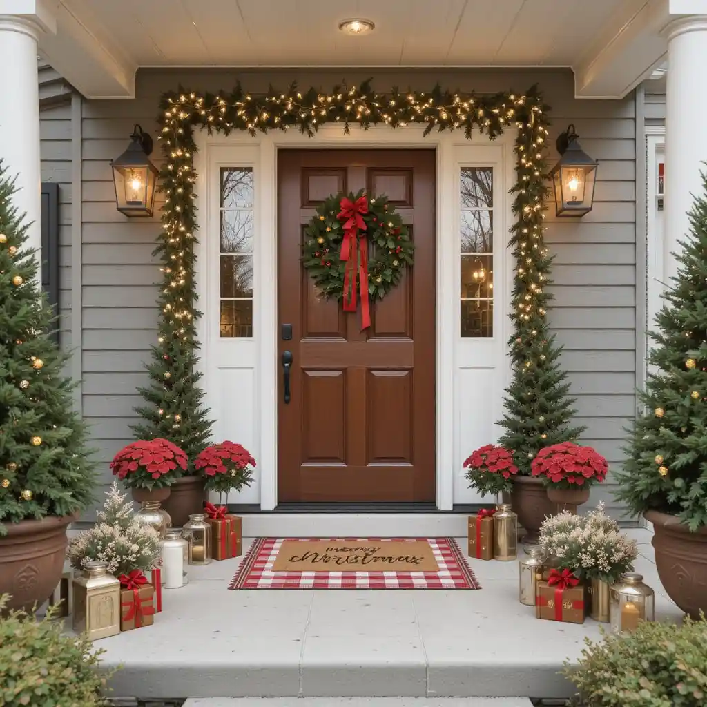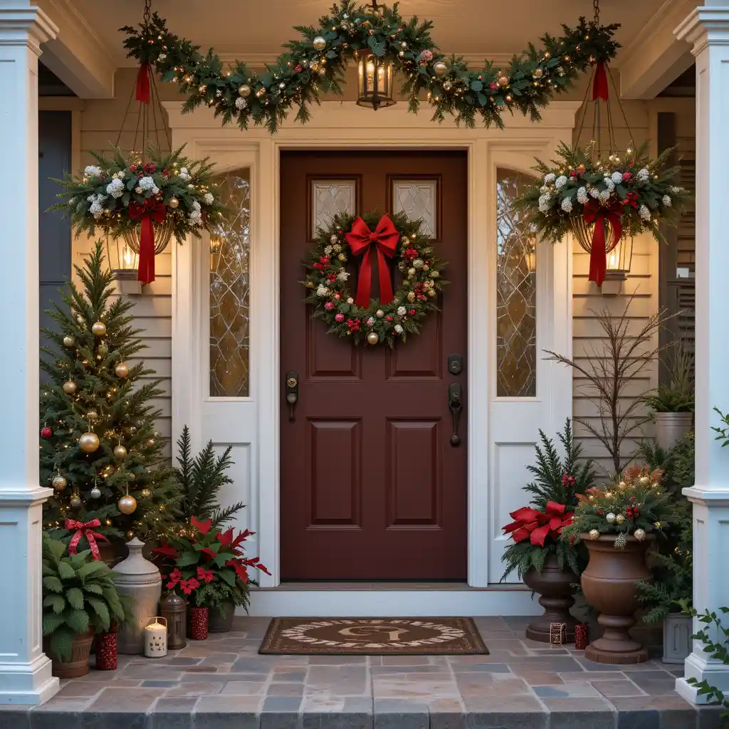 Frame your doorway with lush green garlands decorated with red bows and ornaments. It creates a timeless and traditional Christmas look. Christmas Front Porch
