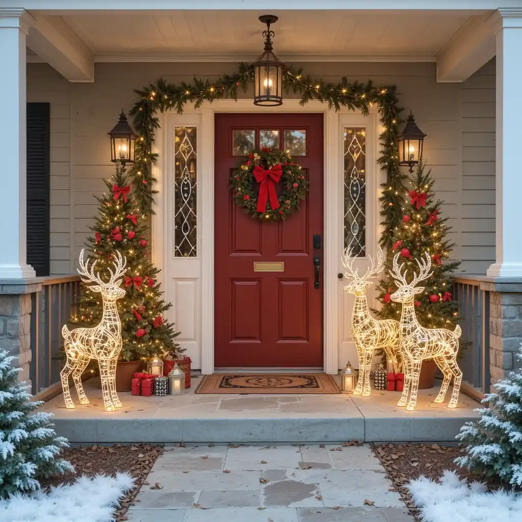 Add charm with illuminated reindeer figures on your porch, creating a glowing, family-friendly display.