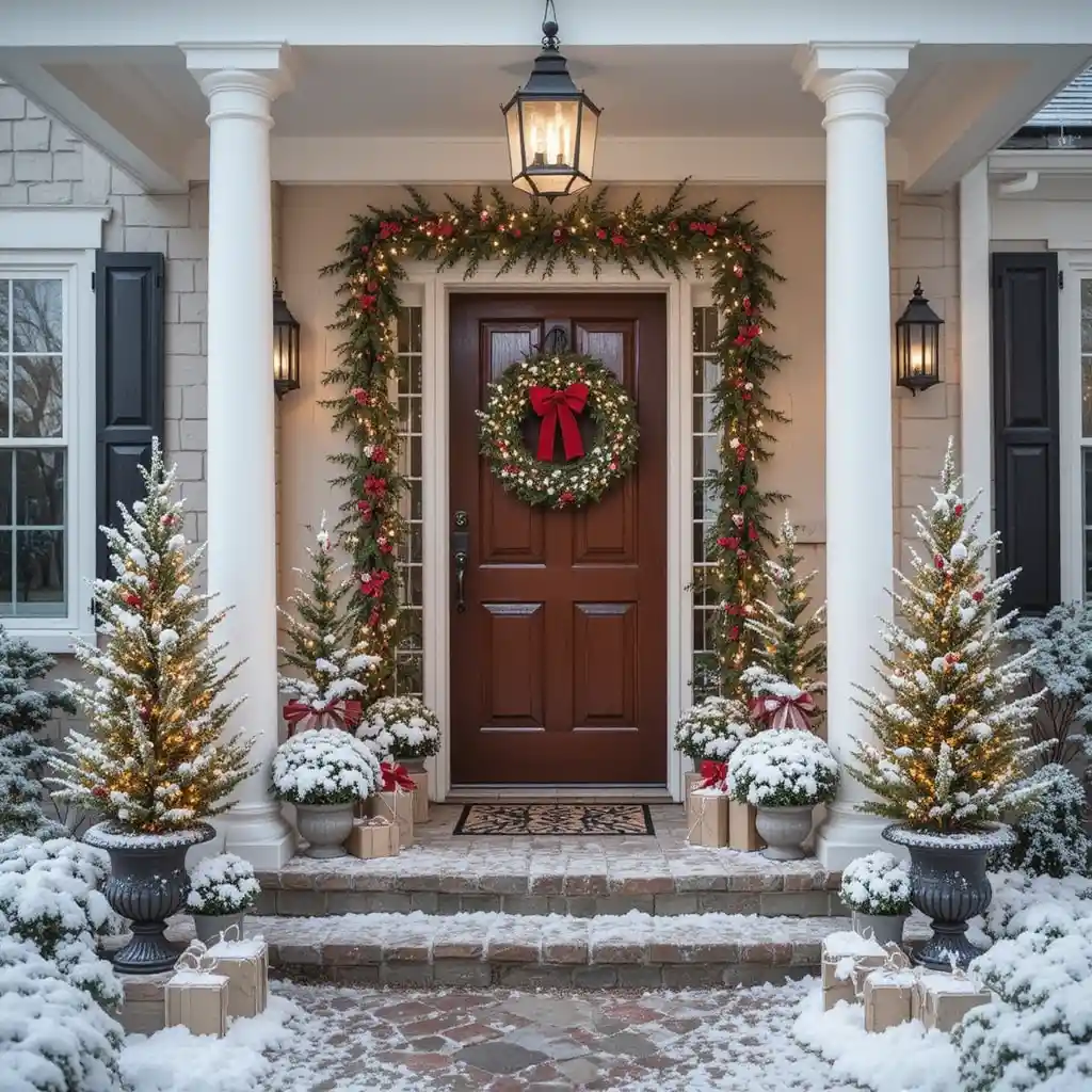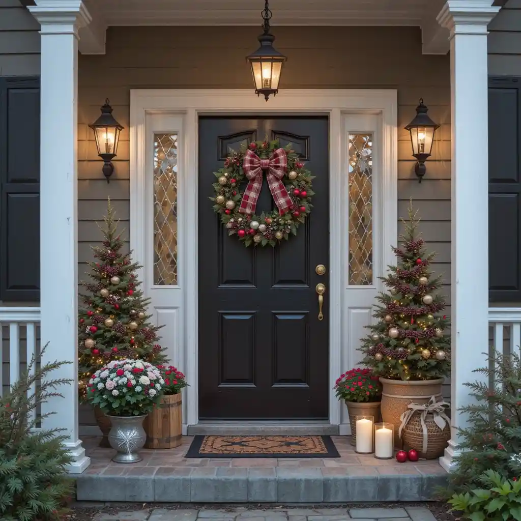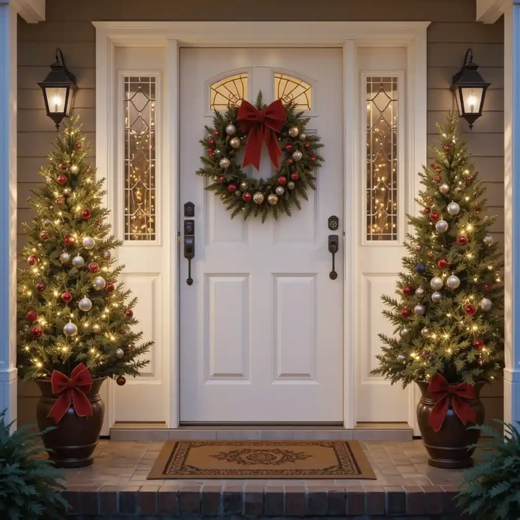 Use mini potted trees decorated with lights and bows on either side of your door for a symmetrical and festive entry.