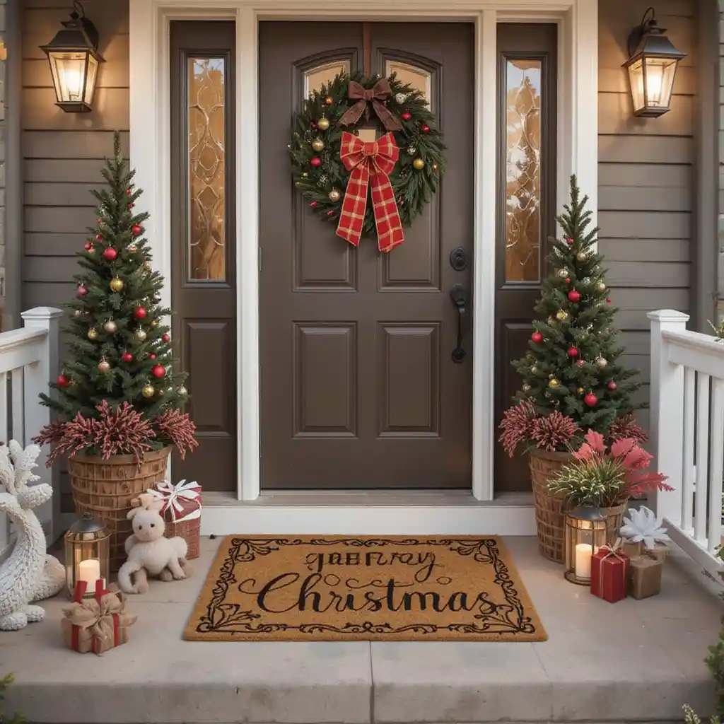 Swap your regular mat with a holiday doormat featuring cheerful Christmas sayings to greet guests in style. Christmas Front Porch
