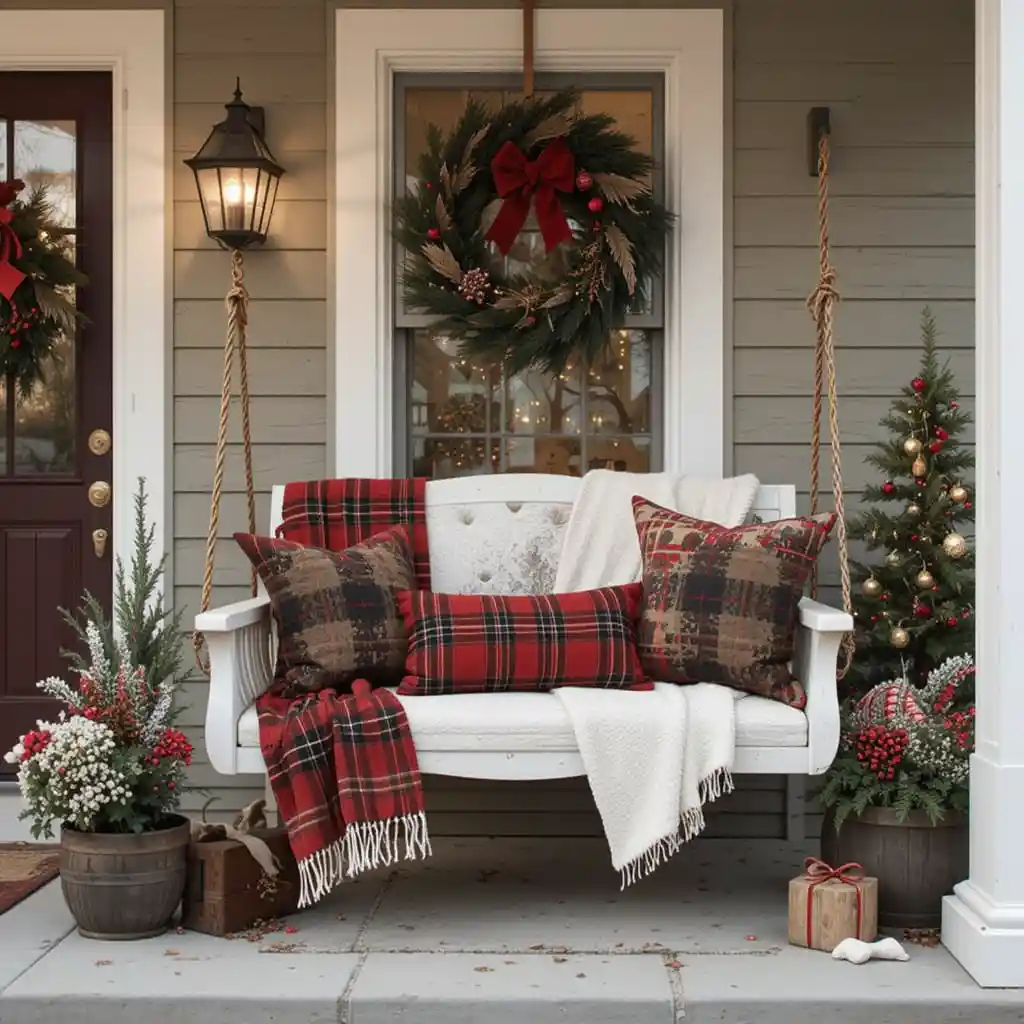 If you have a swing, add cozy plaid pillows and soft blankets to create a warm Christmas seating nook. Christmas Front Porch