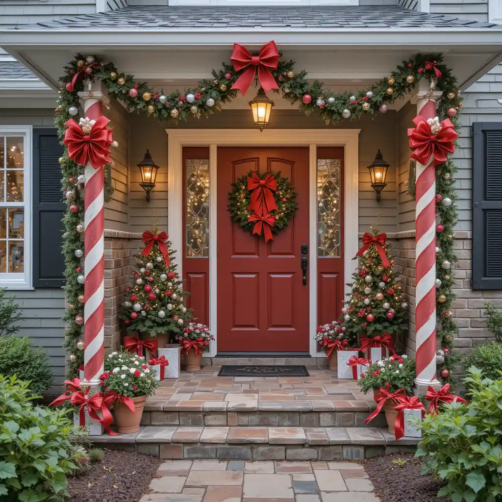 Decorate with candy cane-striped ribbons, poles, and ornaments for a playful porch filled with holiday fun.
