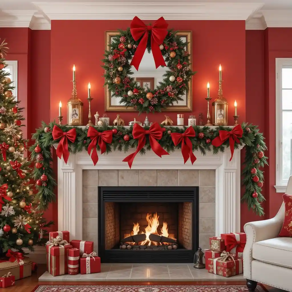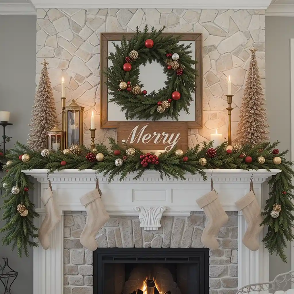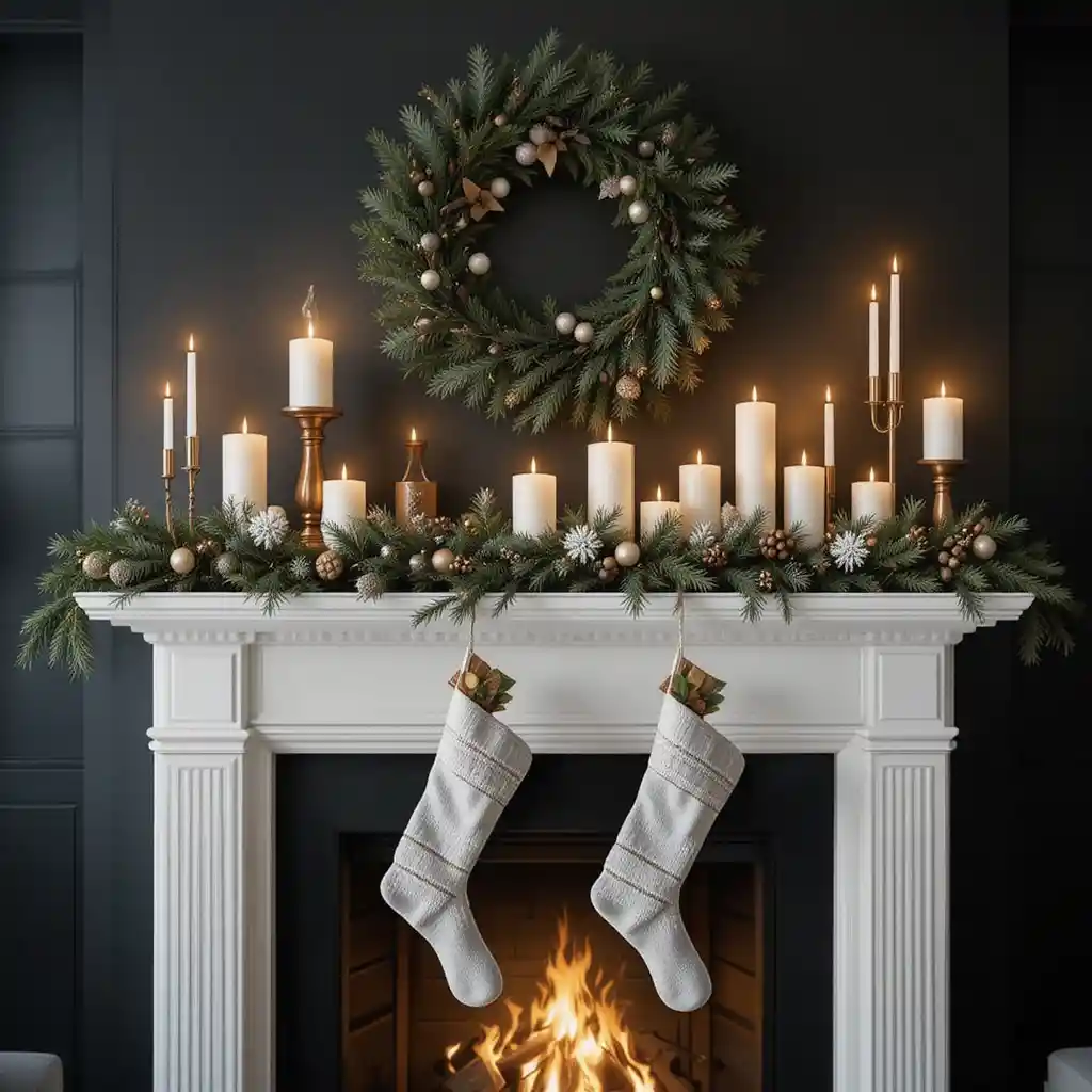 Wrap your mantle in a lush evergreen garland with twinkling fairy lights. This timeless look creates a glowing, festive atmosphere perfect for family gatherings.