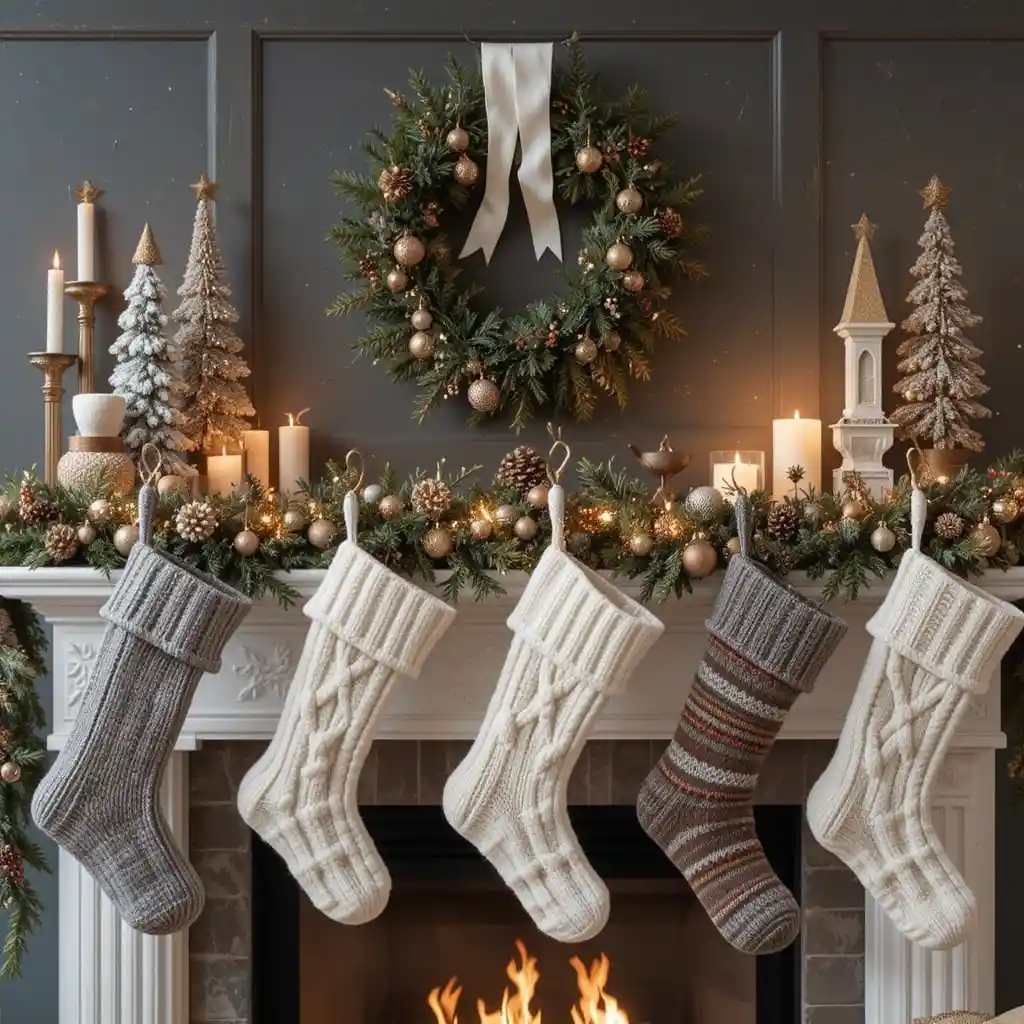 Hang chunky knitted stockings in neutral or holiday tones. Their cozy texture makes the mantle warm and inviting.