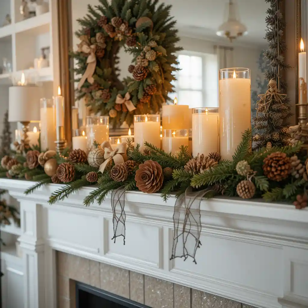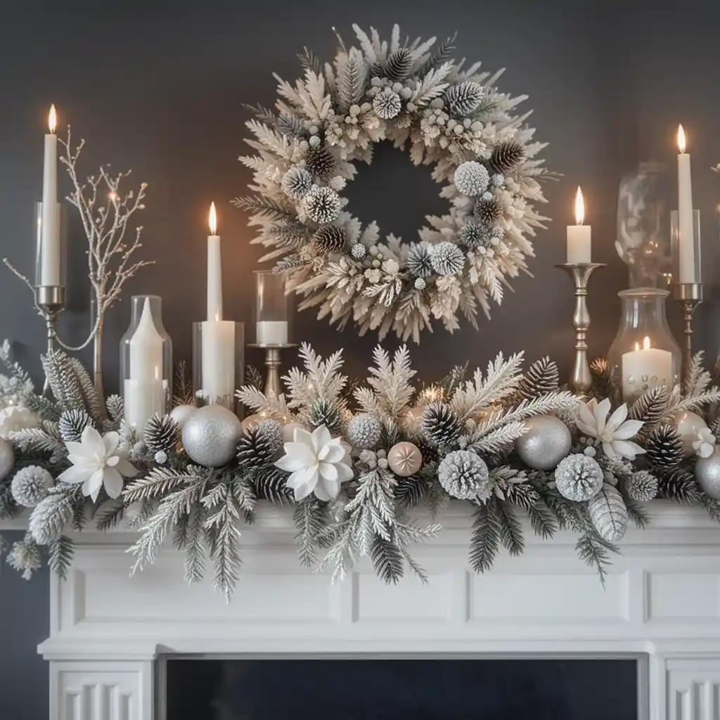 Decorate with frosted pinecones, silver accents, and white candles. This look captures a snowy forest vibe for Christmas.