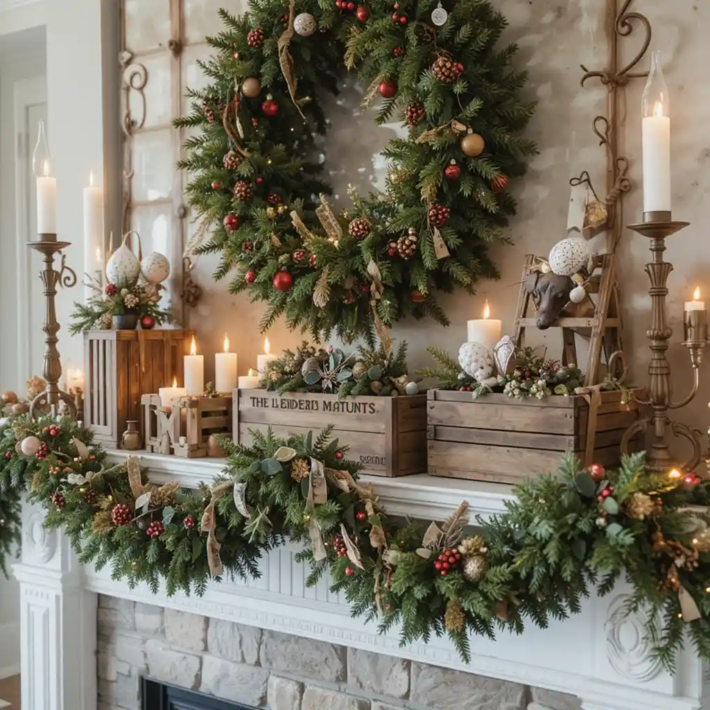 Place small wooden crates or mini sleds on the mantle and fill them with greenery or ornaments. This farmhouse element feels authentic and festive.