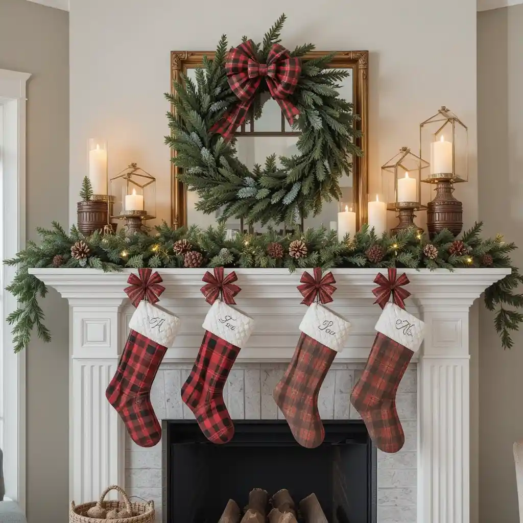 Use plaid bows, stockings, or ribbons mixed with evergreens. The cozy pattern instantly gives your mantle a welcoming farmhouse feel.