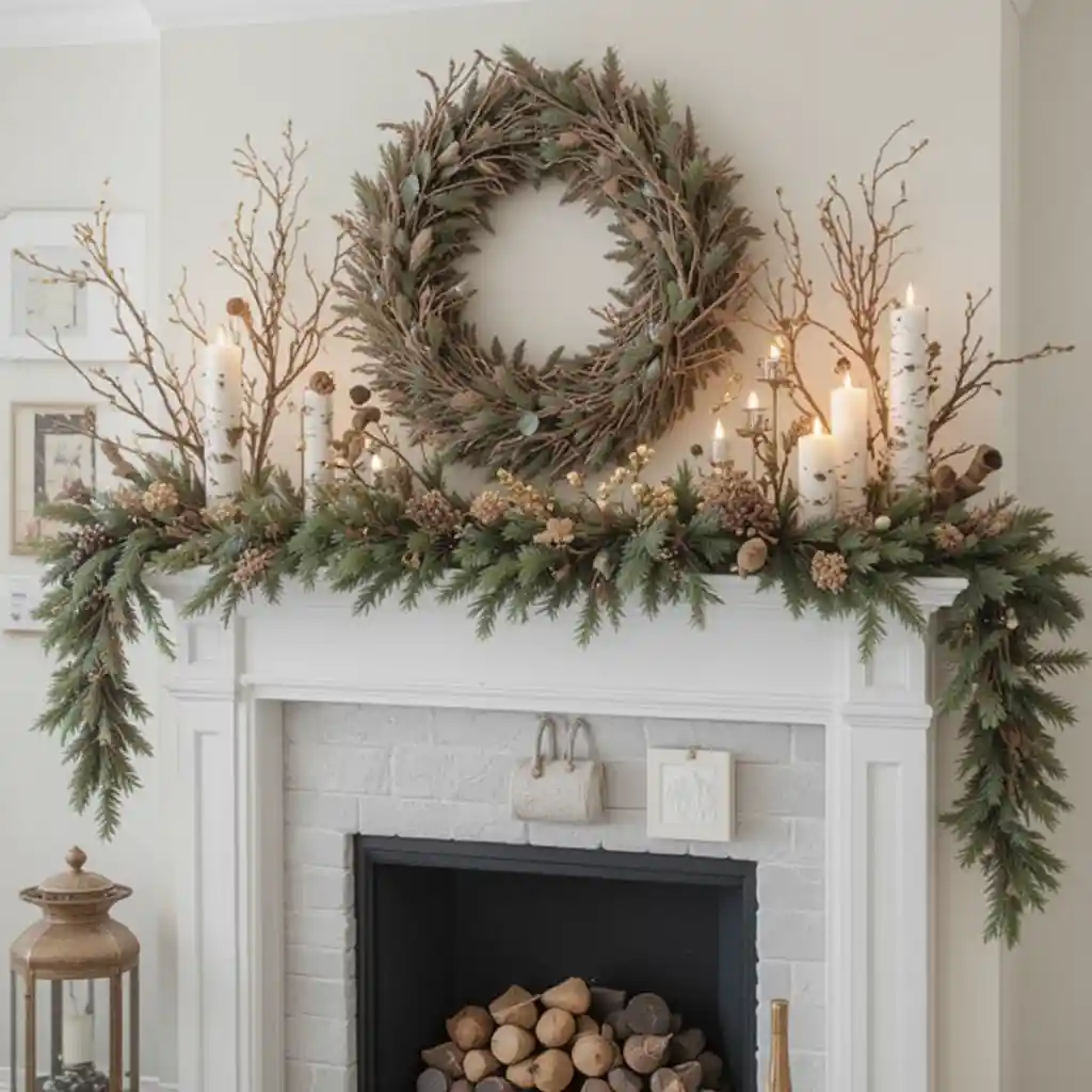 Decorate with birch logs, pine branches, and natural twigs. This rustic theme brings the beauty of the outdoors into your living room. Christmas Mantle Décor Ideas